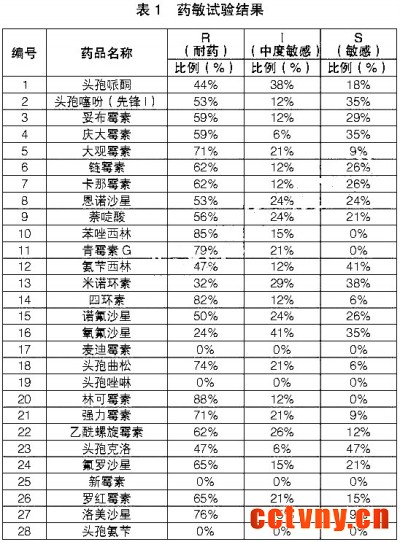 综合73株病菌药敏试验结果分析可见,不同鱼塘病菌对28种药敏片的敏感程度不同,经统计,敏感比例:头孢克洛>氨芐西林>米诺环素>头孢噻吩(先锋Ⅰ)=庆大霉素=氧氟沙星;中度敏比例:氧氟沙星>头孢哌酮>米诺环素>乙酰螺旋霉素;耐药比例:林可霉素>苯唑西林>四环素>青霉素G,详见表1。