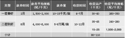 常年采用虾笼捕捞,捕大留小,将达到商品规格(250~300尾/千克)的成虾陆续起捕上市,最后拉网后排水干塘捕捞。“一茬春虾”捕捞时间从4月中旬至7月上旬;“二茬秋虾”捕捞时间从10月上旬至翌年1月上旬。青虾池塘“双茬”健康养殖一般收获情况见下表。