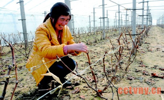 春节期间,孙春英在大棚里给葡萄苗绑枝儿。