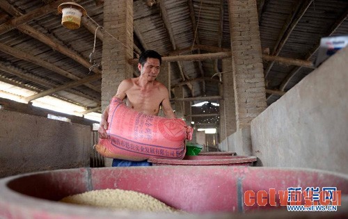 曾九生准备将饲料倒入桶内(3月20日摄)。