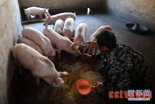 曾九生在小猪栏里用饲料“引诱”小猪,以便抓猪称重、检查(3月20日摄)。