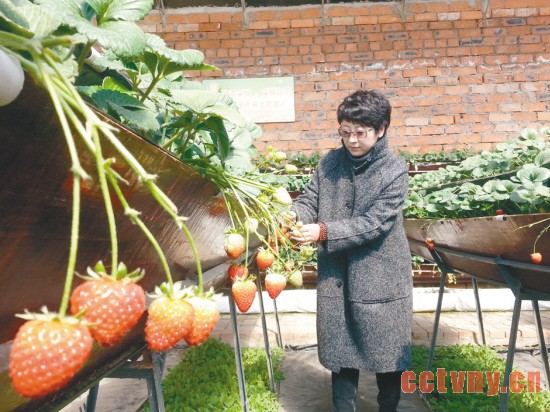 在作物种植上,刘秀英采取立体方式,地面种着、半空举着、墙上挂着、空中吊着,每一寸土地都不浪费。“一米宽的地面只能种两垄草莓,可搭架子在空中种植可以扩充到四垄。架子底下还可以套种山野菜,经济价值远超普通蔬菜。”刘秀英说,普通农民种一亩“丹东99”草莓大概产5000-7000斤果实,她的暖棚可以增产近3倍,所以,她的3个暖棚收成赶得上普通农民的9个暖棚。