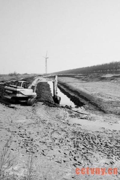 用挖土机抓出环沟内的淤泥进行曝晒,用翻耕机对平台进行翻耕曝晒(如图),时间不低于一个月。