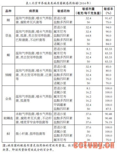 需要注意的是:在无法送样检测、但怀疑是细菌性疾病时,可按我们制定的2014年北京市养殖鱼类病原菌敏感药物谱(见表1)选药,选择药物有效的机会将大幅提高。敏感药物谱依据为2014年检测的北京市51家75个样品的135株病原菌的药敏基础数据。