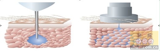 微观图:左图(图二)为传统针头注射 右图(图三)为无针头注射器注射