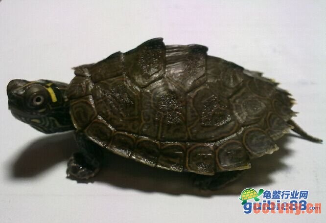 德州地图龟,外观形态:雄性体长2 3/4-3 1/2" (7-8.9 cm);雌性体长4-5" (10.2-12.7 cm)。是最小的一种地图龟。背甲橄榄色,带有黄色线条构成的网状图案;盾片突起;脊棱上有低钝的刺突,刺突尖头常呈黑色。腹甲黄色,沿着盾片接缝长有黑色的细线。眼睛后方,有亮黄色至橙色,并且通常都呈“J”型的条纹向后延伸。下颚上长有黄色或橙色的纵向斑渍,周围绕着黑边。
