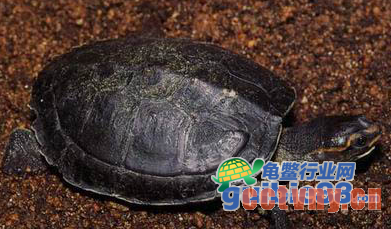 特征:头部较尖,头顶边缘有一条粗细不匀的条纹,呈桔红色,头顶中央有一呈“个”字型的淡黄红色图案,鼻孔两侧有桔红色不规则图纹;背甲黑色,边缘有白色细条纹,背甲中央嵴棱明显;腹甲为淡黄色,每块盾片上有大块斑点,四肢边缘两侧有两条白色条纹,四肢灰黑色,指、趾间具丰富蹼。