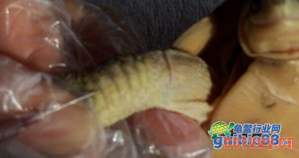 图5,注射手法,借用何莲诊所的图片,我自己注射的时候两手不空,没法拍照,其实我注射的位置不是大腿根部,而是小腿和脚掌,因为我的龟一直缩腿,大腿都 在壳内,好不容易把小腿拉出来了。又不敢太用力怕把他腿拉坏了。虽然注射位置不同,但注射要领还是一样的就是进针与腿成小于30度的夹角,不要扎住乌龟的 腿骨头或者骨关节。
