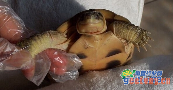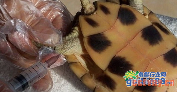 5消毒完后,用注射器针与腿成小于30度的方向扎针,动作要稳,要把乌龟腿抓稳,扎针的时候乌龟会挣扎。看到针进去大概0.5cm左右就开始推药水。然后拔针,用沾有碘伏的棉签按压一下针口,干养一晚上吧。第二天在给它下水。病龟一般建议干养。
