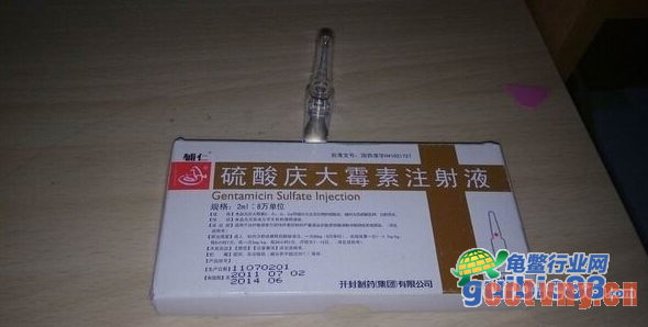 图4:治疗肠胃炎的庆大霉素针剂,成人100斤体重一只针剂是2ml,我的乌龟算2斤其药量就是2ml*(2/100)=0.04ml估计两倍用药也不会有什么问题,就按0.1ml的量注射。