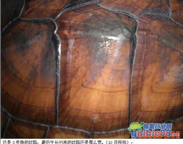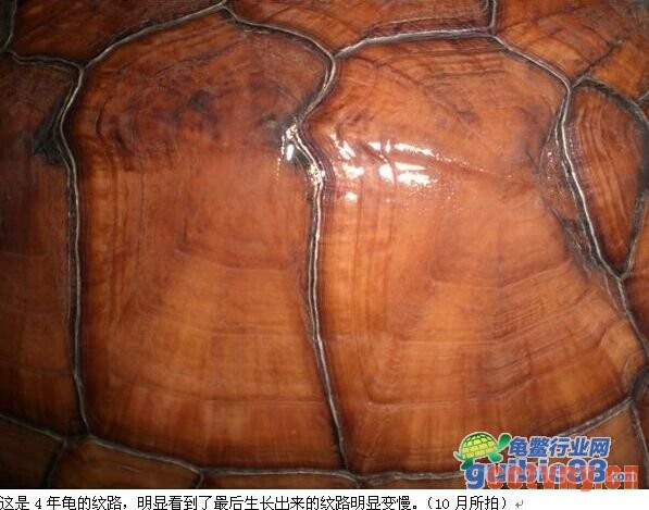 第三、有时候我们在看背甲,没法看清时,可以看它的腹甲中间的白色生长纹路,是否窄,越窄说明越老(龟生长速度很快的,腹甲中间的白色生长纹是很宽,很嫩的,而老龟就没这现象,可以说根本看不到白色生长纹)。