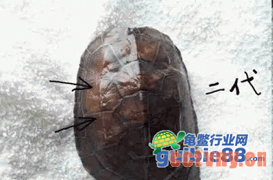 【杂黑2代】体型似北石,特征介乎纯种与1代之间。脊棱优化但是还可以看出来练成一线,尤其是新生长的甲壳仍然有脊棱凸起(图7);侧边后沿有一点翘,但是与“牛仔帽”有很大差别(图8)个人认为脊棱、侧边是区分2代与纯种的重点;2代苗甲桥黑色、花桥的数量比例比1代多,但是也有“返祖”现象(图9),尾摆比1代阔,开始有上窄下阔的梯圆型身材;酒窝橙红色。