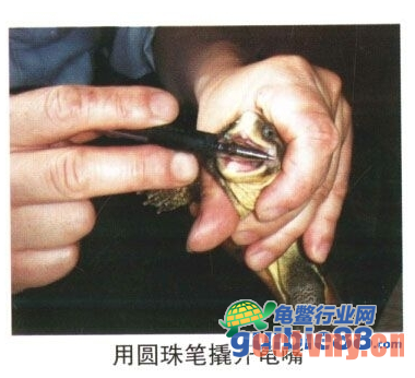 (3)右手用一支圆珠笔轻轻撬开龟的嘴,让龟张开口咬住圆珠笔,然后用左手食指轻轻定稳笔。