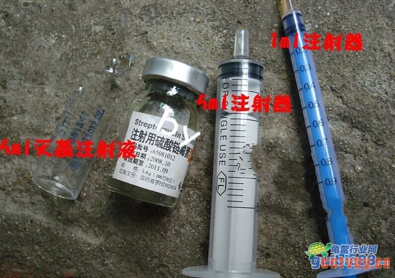 稀释操作:先将5ml灭菌注射液用5ml灭菌注射器注入链霉素注射粉剂中,充分摇匀后(其注射液浓度为20万单位每毫升)。用1ml注射器抽取注射液约0.15~0.25ml的注射液!就基本达到了抽取3~5万单位药物的结果了!