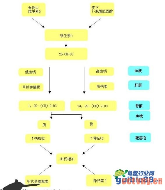 由食物摄取维生素D在小肠内胆汁的协助下与脂肪一起被吸收 吸收后的维生素D与乳糜微粒结合 或被维生素D结合蛋白(DBP)转送至肝进入肝脏的维生素D绝大部分在肝细胞内质网上依靠NADP(辅酶II)镁离子及氧 经25-羟化酶村花氧化为25-羟维生素D后者在血液中并与α球蛋白(维生素运输蛋白)结合再转运到肾脏 在肾线粒体单氧化酶(MFMO) 细胞色素P450及1-羟化酶催化下进一步氧化为1,25-二羟基维生素D 最后进入血循环在组织器官中发挥生理作用.