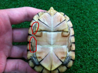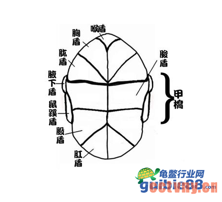 最简单明了鉴别南、北白唇泥龟的方法就在腋下盾与鼠蹊盾是否相连,南部白唇泥龟的腋下盾与鼠蹊盾不相连,北部白唇泥龟的腋下盾与鼠蹊盾相连接。