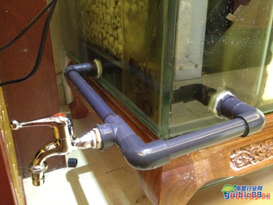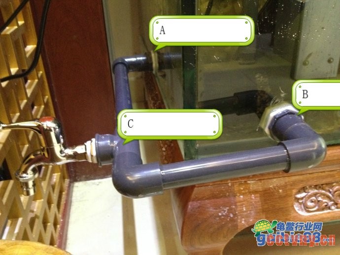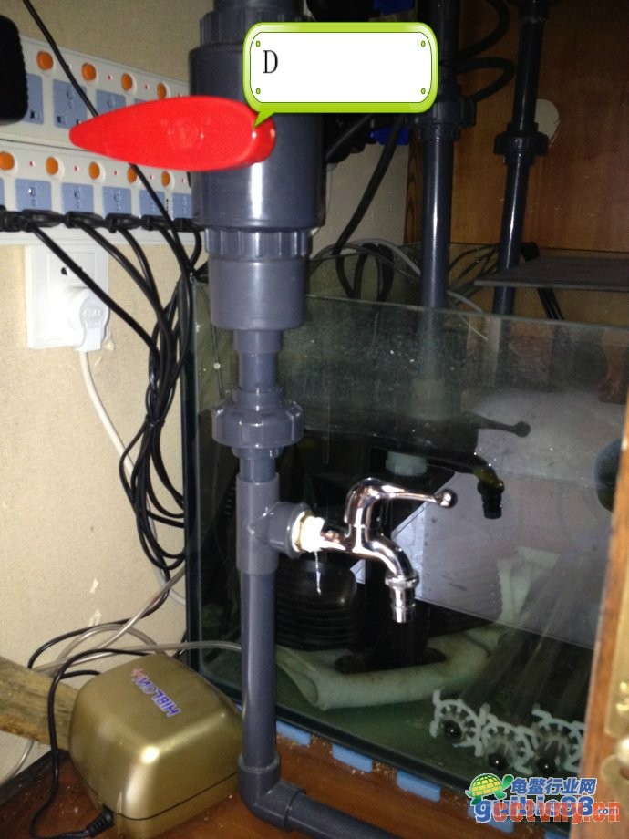 在龟缸过滤悬空隔板下面(A处)和水泵放置槽里(B处)分别打孔连接防水口,通过洗衣机水龙头(C处)连接滚珠软管,把水放到门口的花池内养花,加水的时候,可以把魟缸内的水通过(D处)连接到(C处)放到龟缸内,生态养殖啊,呵呵