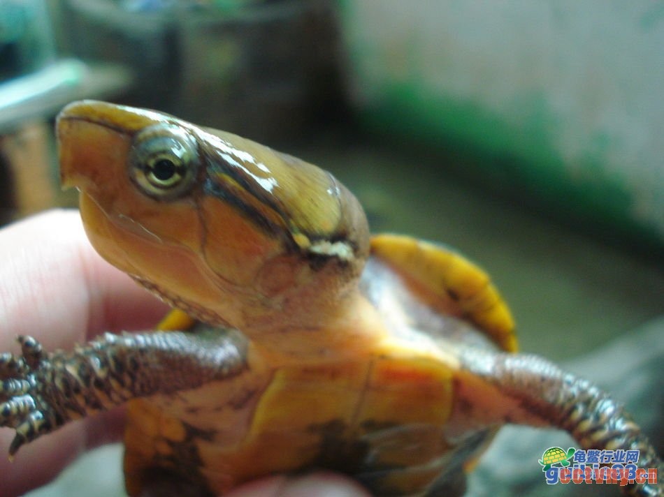 上图为一只越南种鹰嘴龟幼体,面部纹路艳丽,腹甲上有明显的“非”字形斑块。