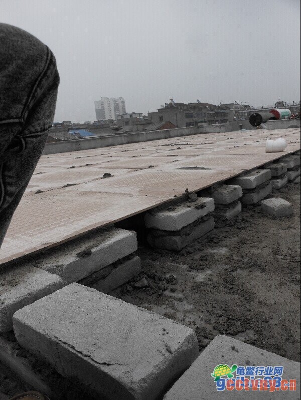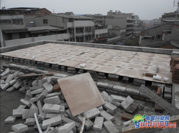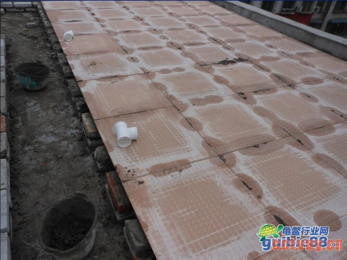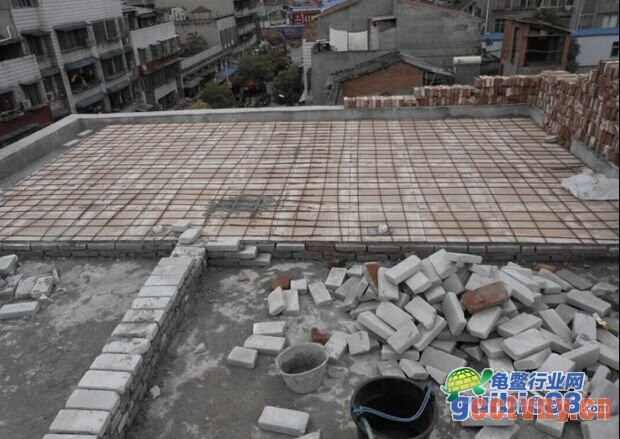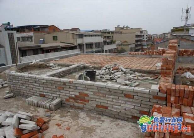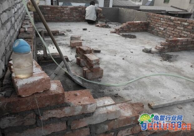 目的是减少龟池对楼板的承重.分摊受力.我是每块地板砖5个点垫砖,四个角+中心。然后平铺地板砖.砖的各边尺寸是6cm 12cm 24cm 我用的6cm的2层 因为我下水管比较粗 ,架砖的目的有两点.1就是埋水管 2就是如果万一不幸龟池底子漏水这样不会直接渗下去.