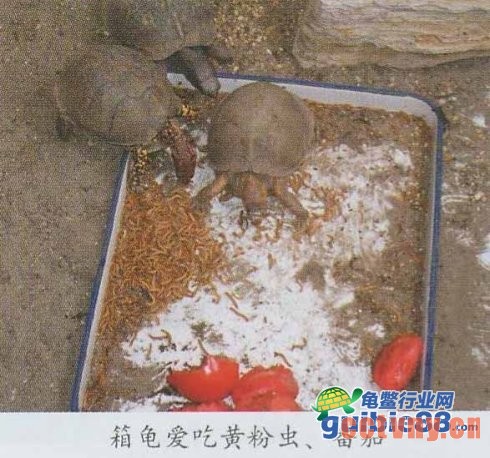 (2)投喂:半水栖龟的食性是杂食性,荤素兼食。动物性食物包括昆虫、水生小动物、无脊椎动物等,如蜗牛、蛞蝓、蚯蚓、蠕虫、蟋蟀、黄粉虫等;也食低脂肪的猫食、狗食。植物性食物包括一些菜叶类、瓜果类等,如番茄、香蕉、空心菜叶、青草和葡萄叶等。日常投喂以每天1次或2天1次为宜。春、夏季投喂量较大,秋季和深秋较小,尤其气温不稳定时,宁可少投喂或不投喂,否则,因气温变化大,龟摄入食物后而患消化不良等病症。食物种类以荤素混合较合适,也可每星期以动物性食物为主,每星期投喂1—2次素食。