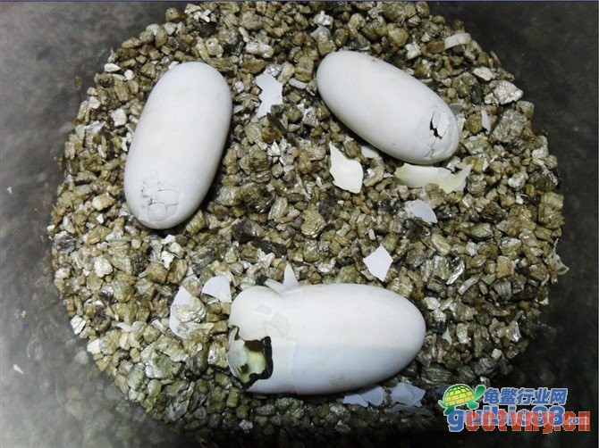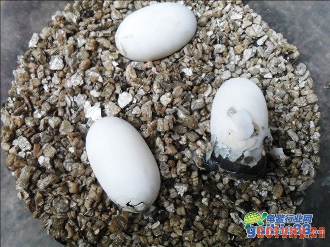 下面是本人去年的黄喉种龟产蛋及孵化的一些照片资料。仅供参考!(7个受精蛋孵化了6个,没有孵化的那个是未发育完善的白化变异,84天未出壳被我剥死了,其中4个蛋孵化45天左右出现裂缝,其中一个最小的还流出了液体,用碘酒消毒处理了下。后期还是孵化了。部分照片丢失没保存。照片里只是我4个受精蛋孵化出来的三个。另外三个孵化出来的苗子是朋友的没留照片。