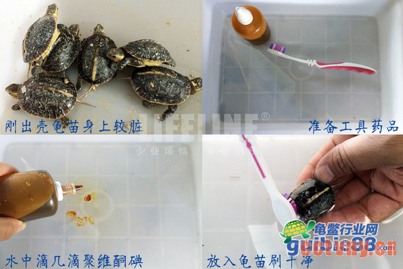 黄缘龟苗出壳后,身上大多带着蛋内的黏液和蛭石的碎片,所以在把龟苗放入育苗池之前,一定要先消毒,这样可以防止交叉感染。消毒步骤很简单,只要准备一盆清水,一瓶聚维酮碘溶液,一个牙刷即可。(具体步骤细节可以参考LIFELINE文章《图解水龟出壳处理方法》)