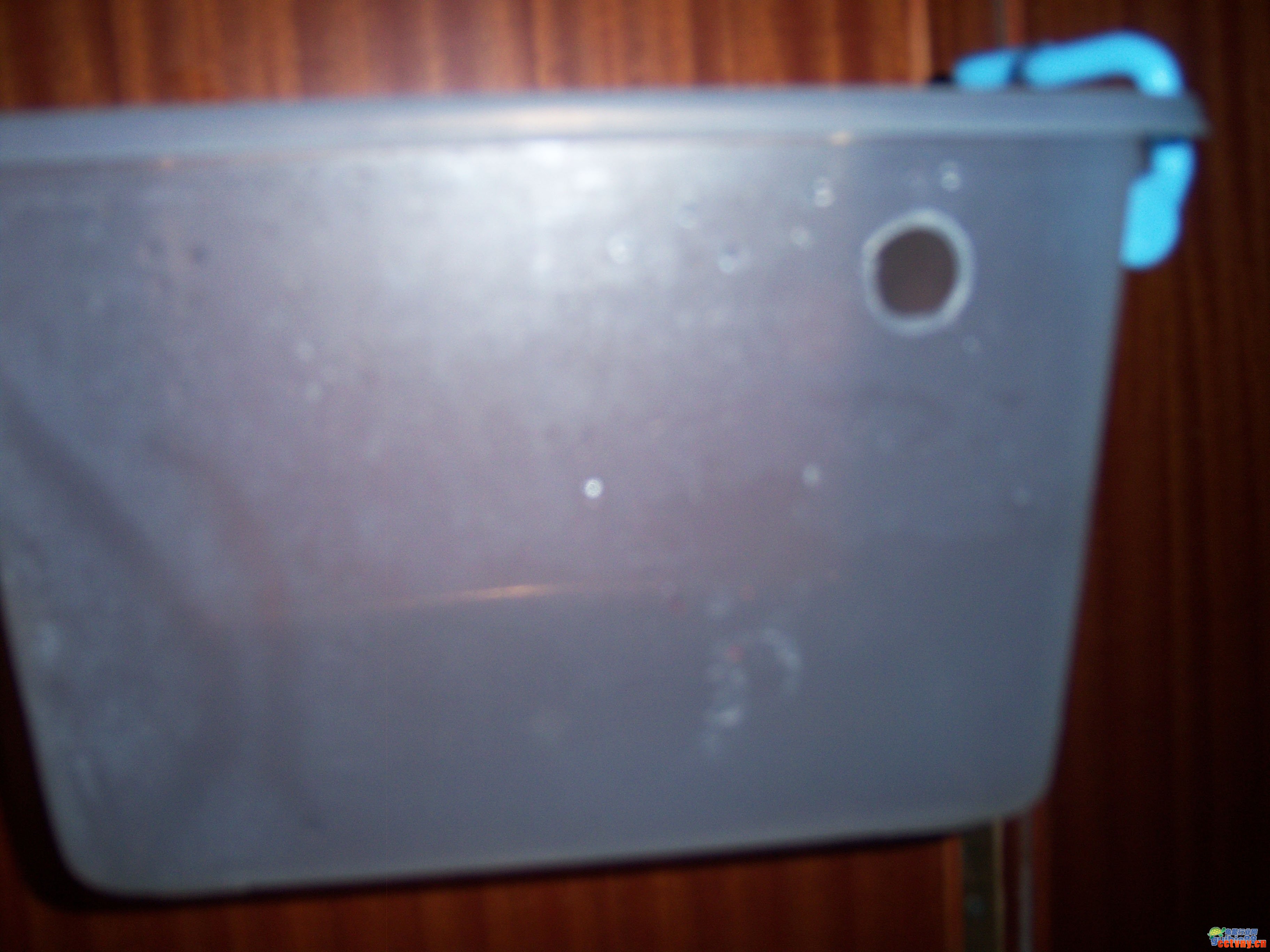 一、 准备一个小塑料箱做过滤桶,大小可以根据水箱的尺寸自主决定。我的水箱尺寸是70*50*38,选的过滤桶尺寸是25*15*15。把顶针烧红,在左上方烫开一个洞,做为进水口。
