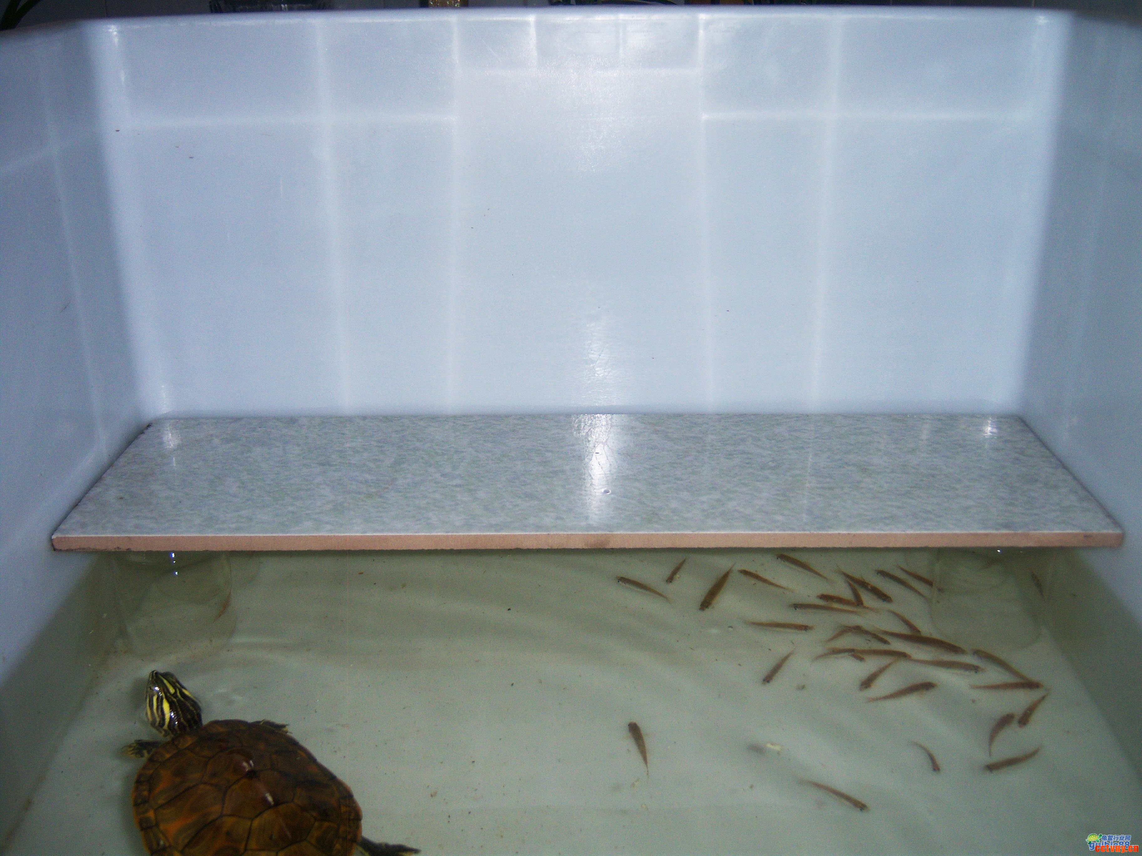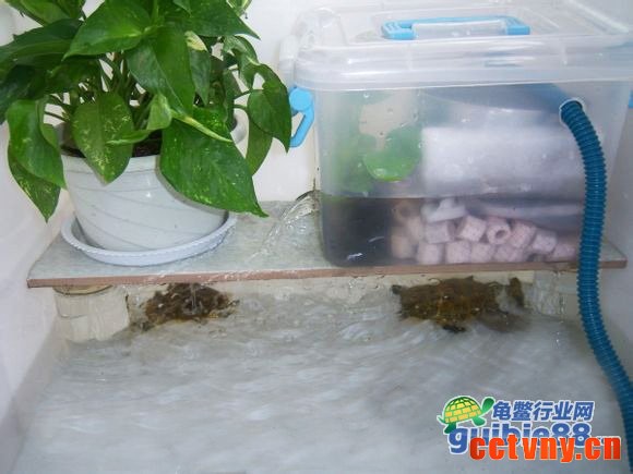 五、用玻璃杯支起一块瓷砖,上面放过滤桶,下面就是躲避穴,一举两得,而且不占用箱子的水体面积。把过滤桶放在瓷砖上,接入水泵管子。