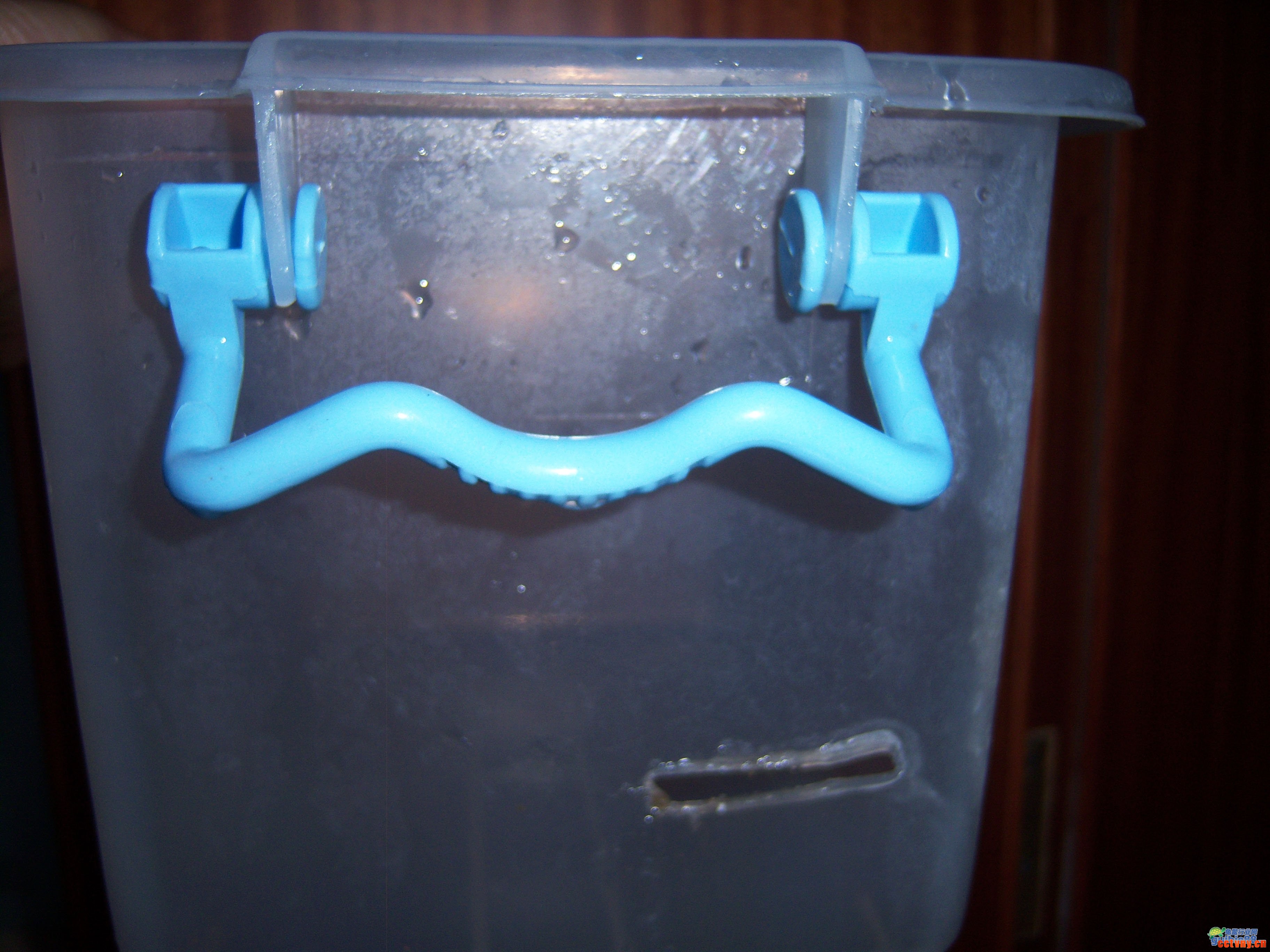 一、 准备一个小塑料箱做过滤桶,大小可以根据水箱的尺寸自主决定。我的水箱尺寸是70*50*38,选的过滤桶尺寸是25*15*15。把顶针烧红,在左上方烫开一个洞,做为进水口。