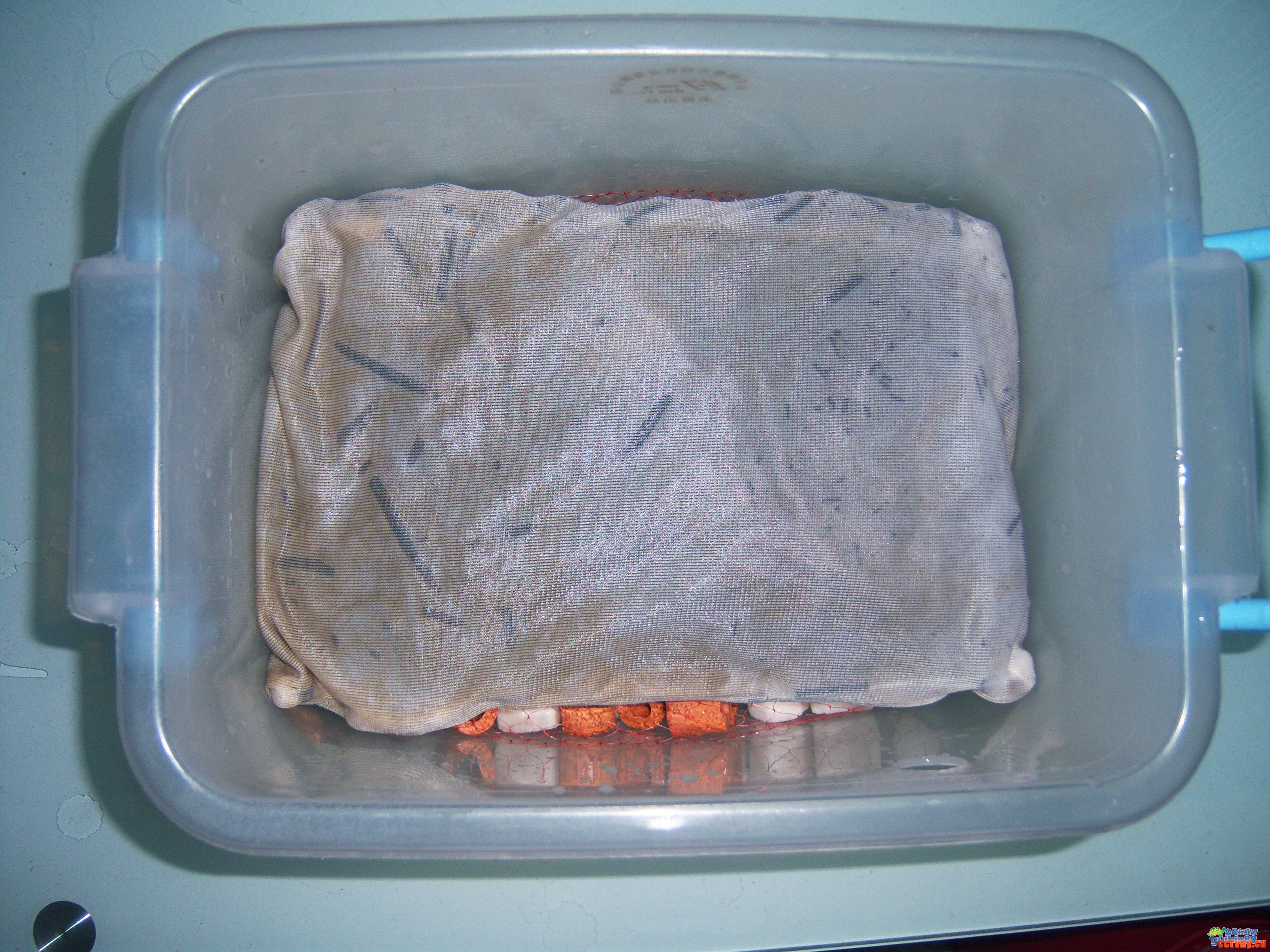 四、过滤棉上放一个塑料筐,可以过滤杂质,减少清洗滤棉的次数,在进水口同样的位置烫一个洞,方便水泵的管子进来。