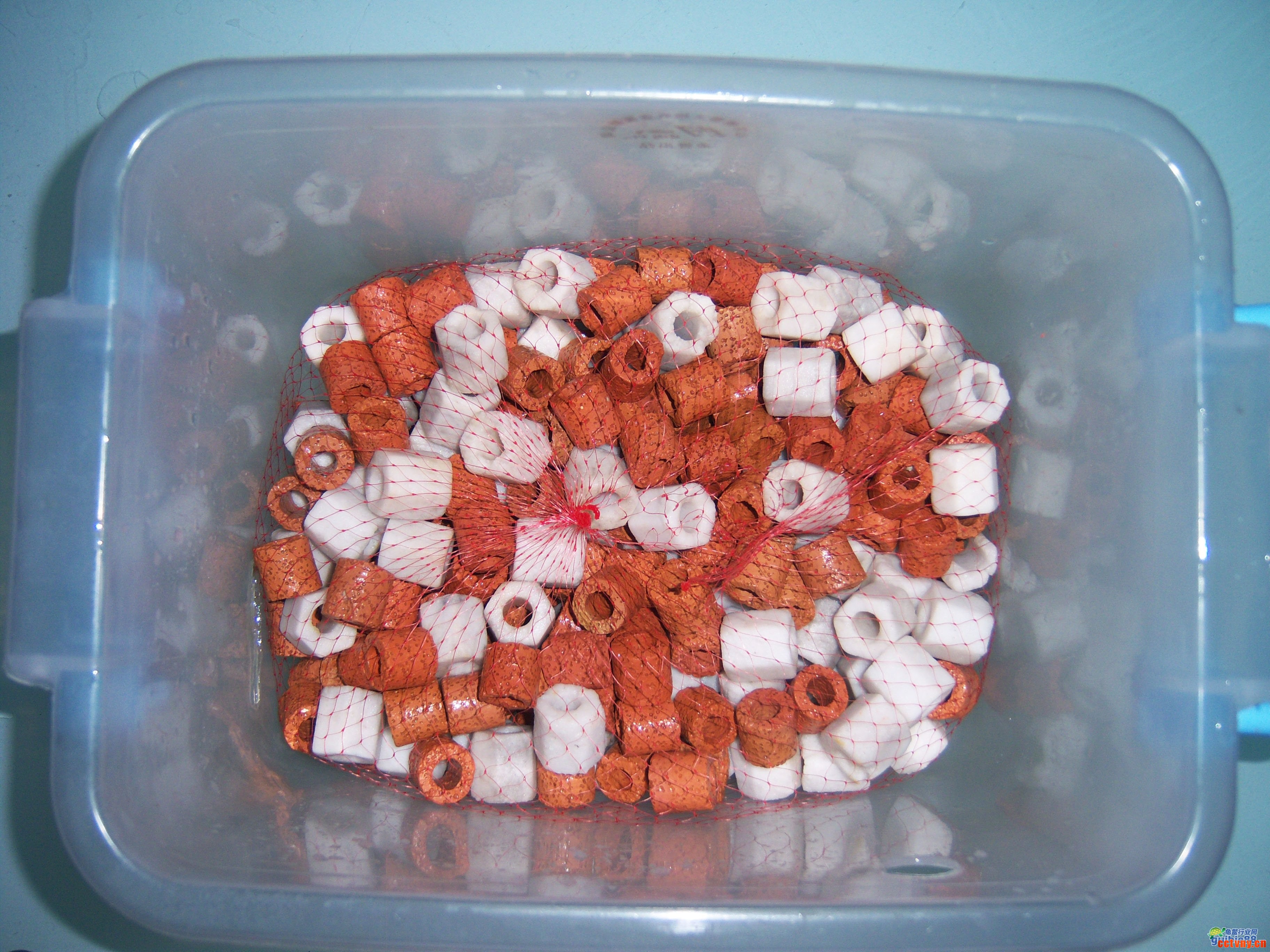 三、 在过滤桶中摆放滤材,一斤陶瓷环,一斤火山岩环,一斤半活性炭,过滤棉。(其他滤材也行,如火山岩、麦饭石、石英珠、生化棉等)