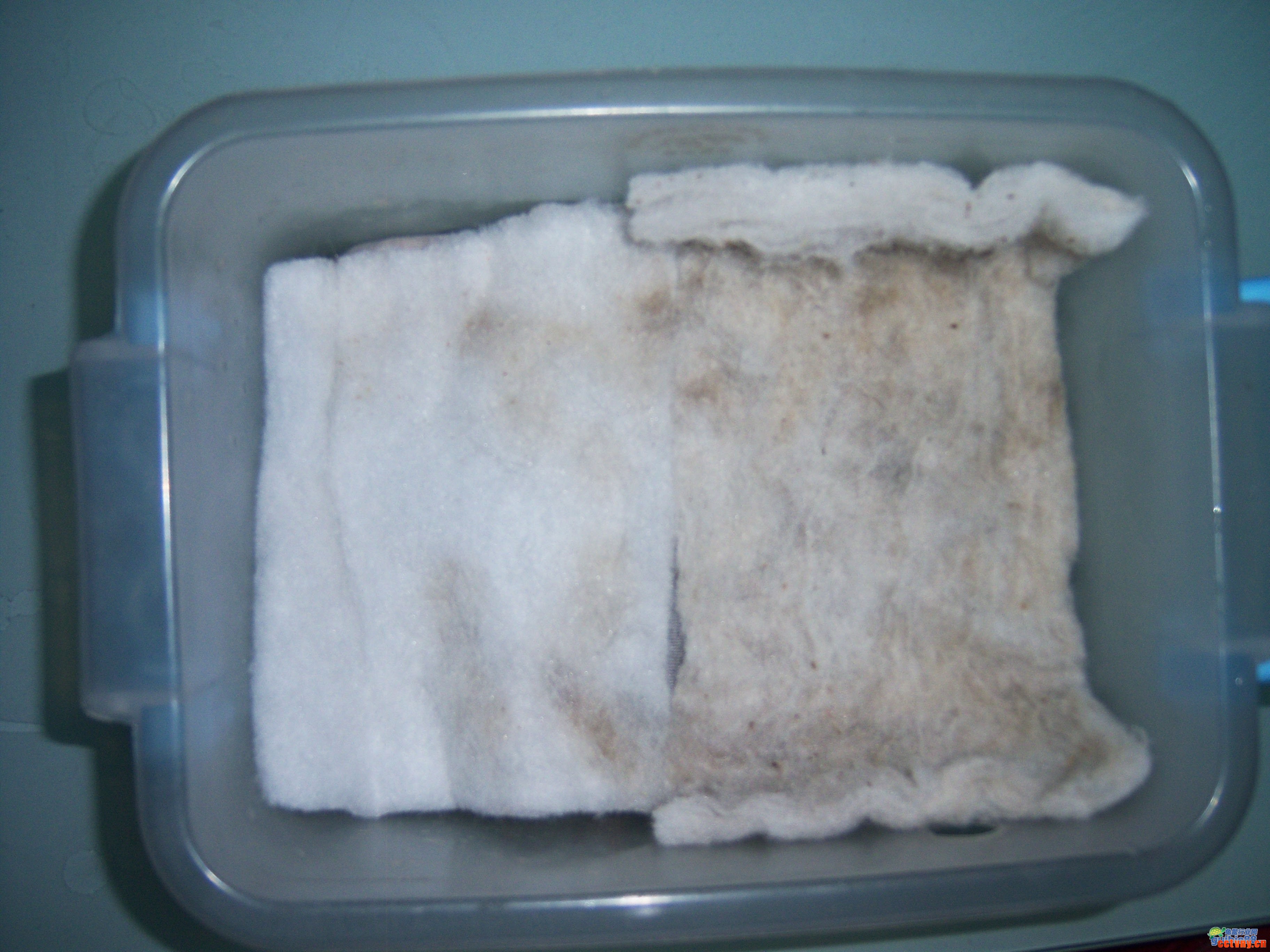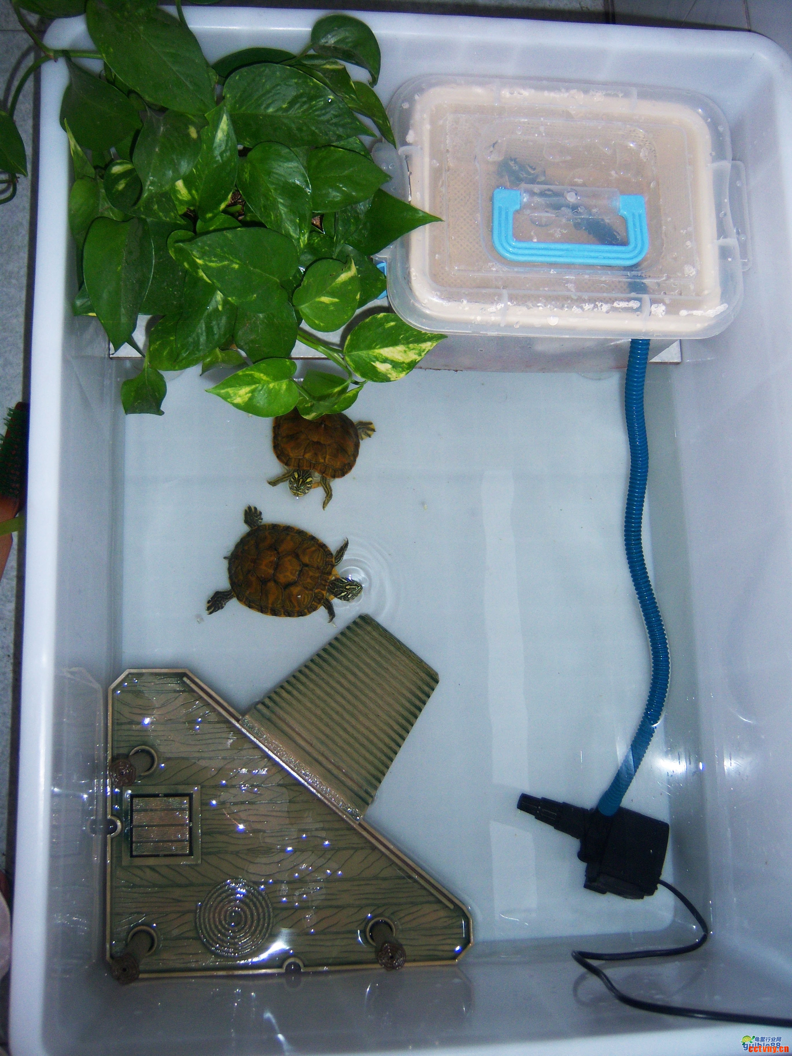 五、用玻璃杯支起一块瓷砖,上面放过滤桶,下面就是躲避穴,一举两得,而且不占用箱子的水体面积。把过滤桶放在瓷砖上,接入水泵管子。