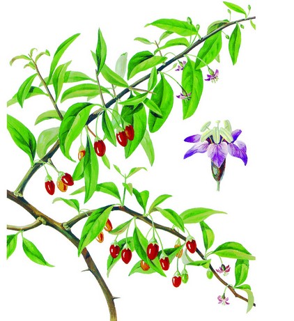 形态特征:灌木,高达1米余,多分枝,枝细长柔弱,常弯曲下垂,具棘刺,淡灰色,有纵条纹。单叶互生或于枝下部数叶簇生,卵状狭菱形至卵状披针形、卵形、长椭圆形,长1.5―3.5(6)厘米,宽5―10(22)毫米,先端锐尖,基部楔形,全缘,两面均无毛。花常1―2(5)朵簇生于叶腋,花梗细;花萼钟状,先端3―5裂,裂片多少有缘毛;花冠漏斗状,紫色,先端5裂,裂片向外平展,与管部几等长或稍长,边缘具密的缘毛,基部耳显著;雄蕊花丝长短不一。浆果卵形或矩圆形,深红色或桔红色。花期7―8月,果期8―10月。
